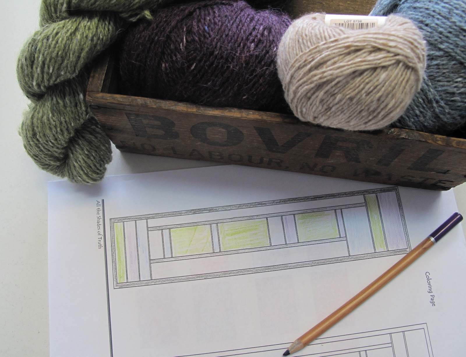 This morning there was a lovely message from Ravelry in my in box saying that a friend had gifted me a pattern. What a lovely surprise! Sending patterns as gifts through Ravelry is really easy and a great way to make a knitter smile. The pattern had only just gone up but she knew I would like it. What a wonderful lady she is. The pattern was All The Shades of Truth, a stole by Laura Aylor and it sent me in to a feverish bout of stash diving. Laura has designed her pattern for a Madeline Tosh yarn but I do have a fair bit of Rowan Felted Tweed. After a bit of humming and haaing I settled on some colours but couldn’t get my head round how they were going to look together. You can tell a brilliant designer from their attention to detail and Laura has put a blank stole at the end of her pattern for you to colour in.