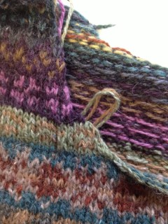 Unfortunately when you start to shape the front it means you can no longer knit in the round but I have been quite keen to learn to knit 2-handed Fair Isle on the purl stitches.