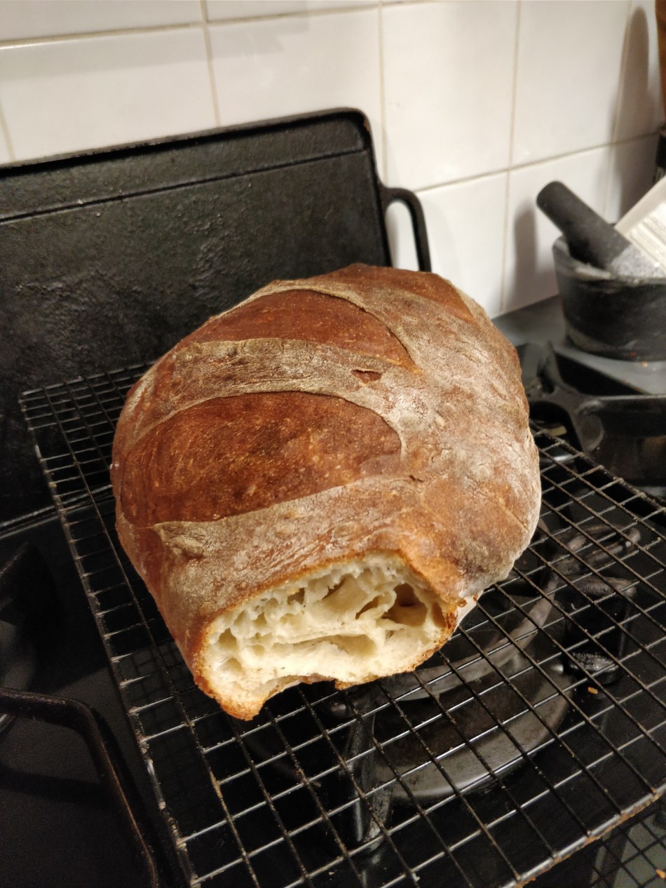 I followed his Batard instructions and this is what I achieved on my first attempt. Look at the air in this loaf. Look at the beautiful colour of the crust. Look how it has risen. I am so happy.