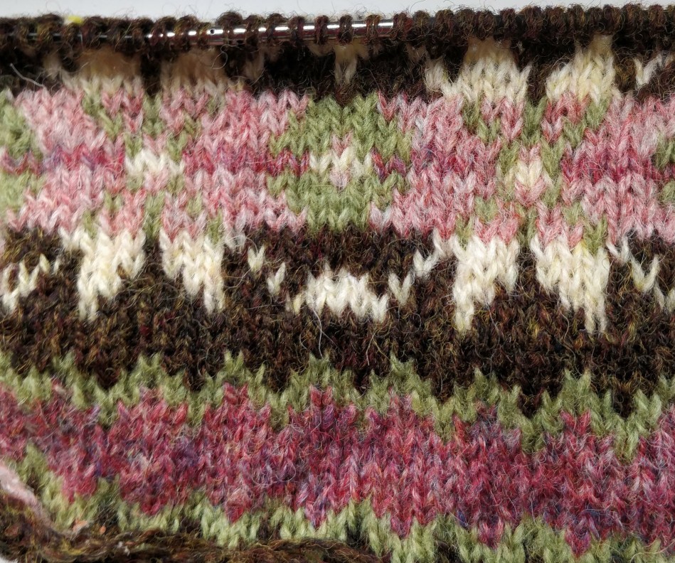 I have now started swatching. I quite like the brown as the background and the way the patterns are coming together, but I may try reversing the pale pink and green to make the darker pink pop out some more. I am going to swatch a couple more designs before I decide.